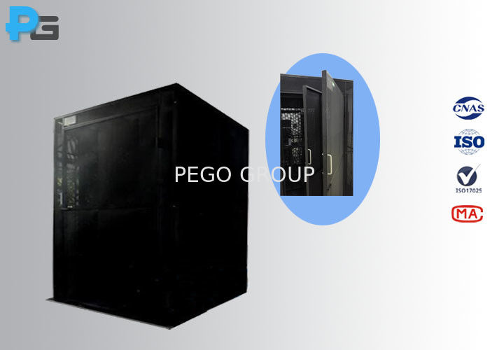 محفظه ضد خروجی مطابق با IEC60598.1 ضمیمه D طراحی شده است، برای آزمایش حرارتی لامپ در شرایط کار عادی و کار غیر عادی استفاده می شود.محفظه ضد رطوبت مستطیل است، با یک پوست دوگانه در بالا و حداقل سه طرف و با یک پایه جامد. پوست دوگانه از فلز سوراخ شده است، تقریبا 150 میلی متر از یکدیگر فاصله دارند،با سوراخ های منظم با قطر 1mm تا 2mmدر بالای محفظه یک صفحه سقف یا یک براکت آویزان قابل جدا کردن با یک قلاب برای تثبیت لامپ در سقف نصب می شود.در پایین طرف محفظه باید سوراخ ورودی برای اتصال سیم نصب شود.برای نصب لامپ، محفظه مجهز به یک نگهدارنده نمونه، به عنوان استاندارد، 2 لایه سیاه تخته جامد برای تثبیت لامپ تحت آزمایش اعمال می شود.